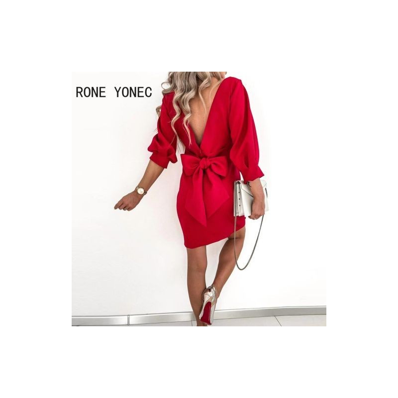 Women Solid Backless Elegant Three Quarter Lantern Sleeves Bow Back Mini A-line Formal Party Red Dress