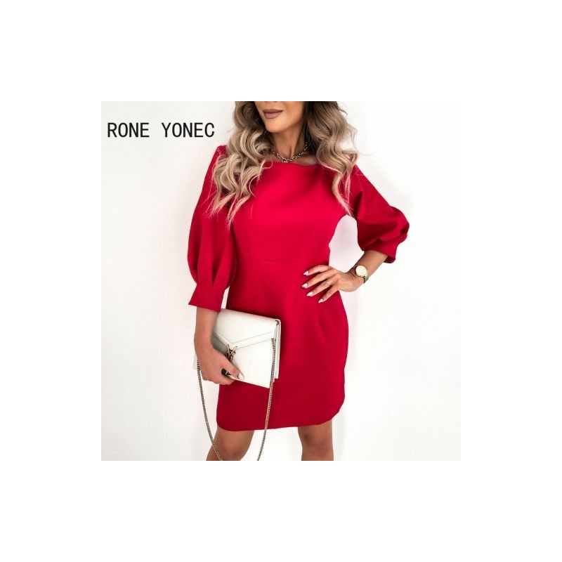 Női tömör, hát nélküli, elegáns háromnegyedes lámpás ujjú, masnis hátú, mini A-vonalú formális parti piros ruha