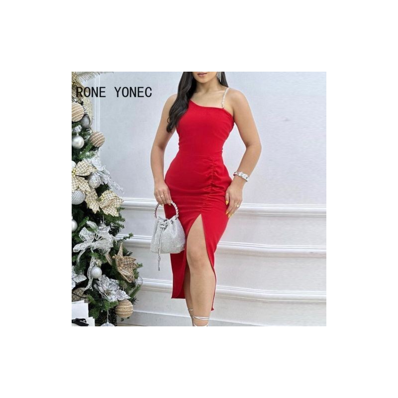 Women Solid Chain Decoration Straps Diagonal Collar Shirring Midi Silt Bodycon Formal Party Red Dresses