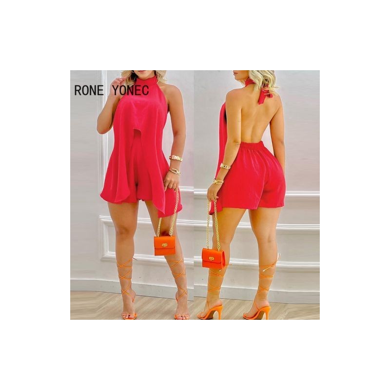 Women Chic Solid Sleeveless Ruffle Hem Backless Romper