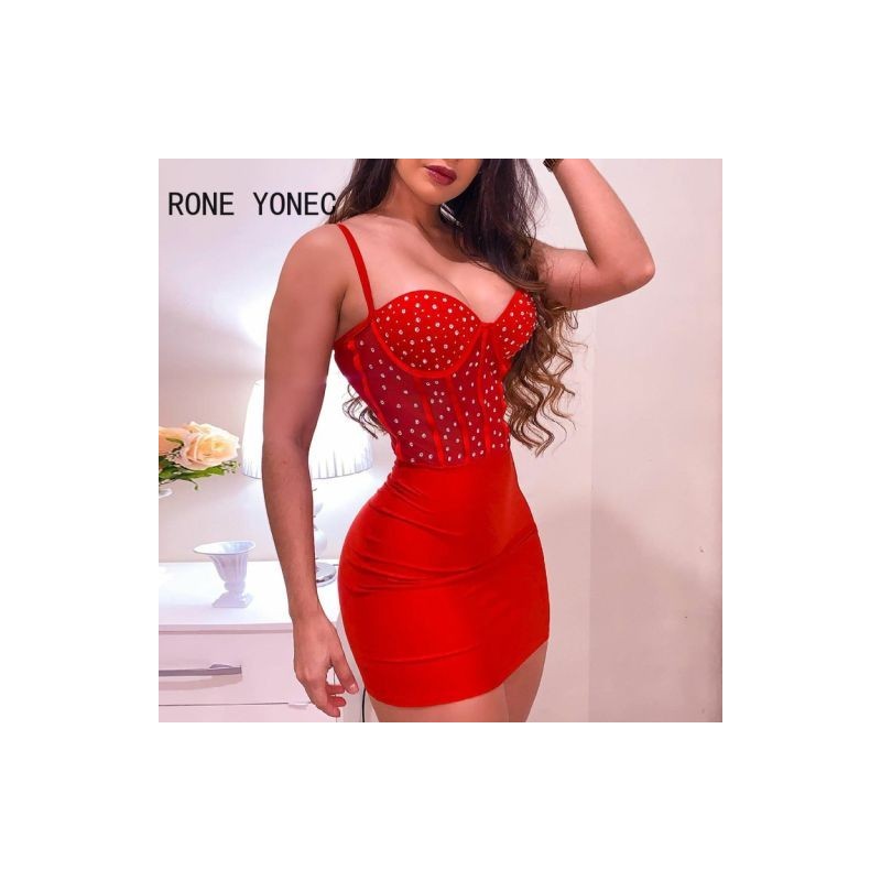 Women Solid Cami Studded Spaghetti Strap Mini Bodycon Sexy Party Red Dress