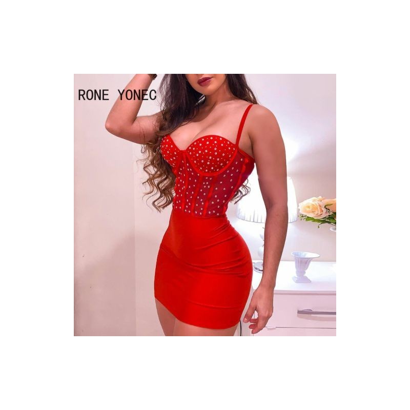 Női Solid Cami szegecses spagettipántos mini Bodycon szexi parti piros ruha