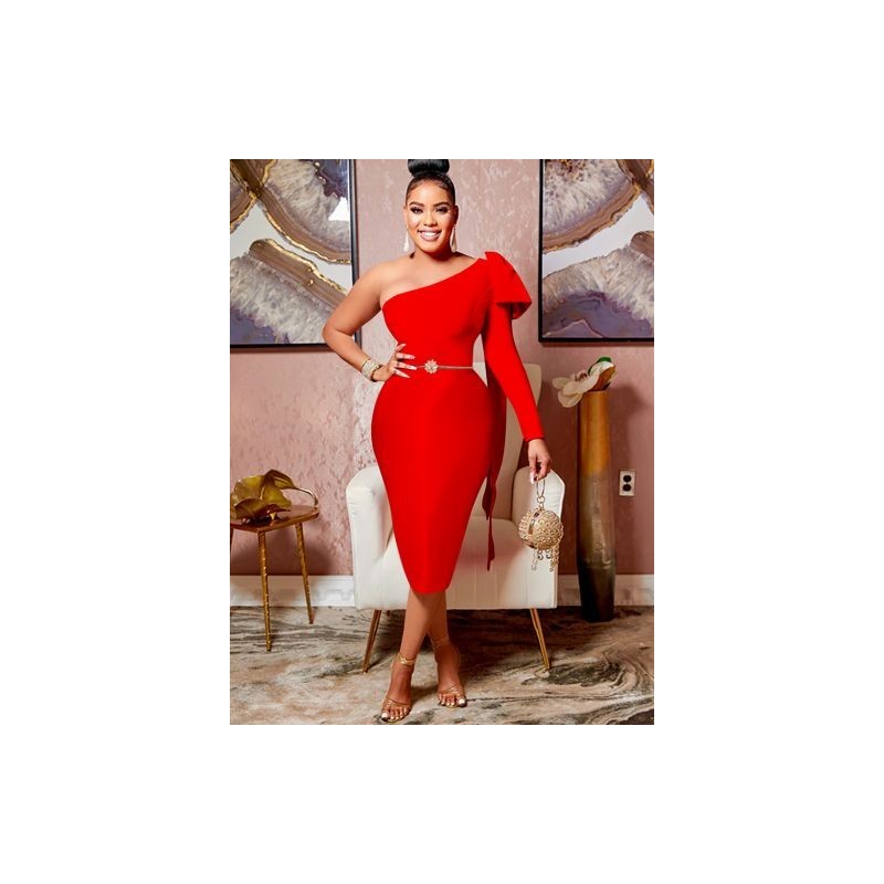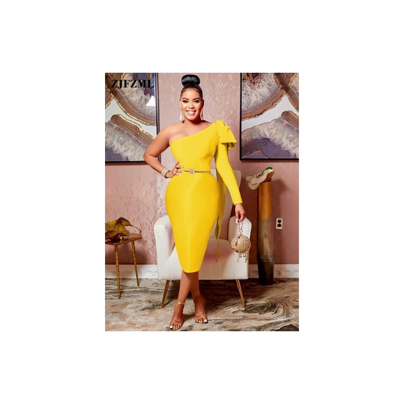 One Shoulder Bow Long Sleeve Bodycon Dress Female Fashion High Waist Body-shaping Dresses Summer Autumn Back Split Midi Vestidos