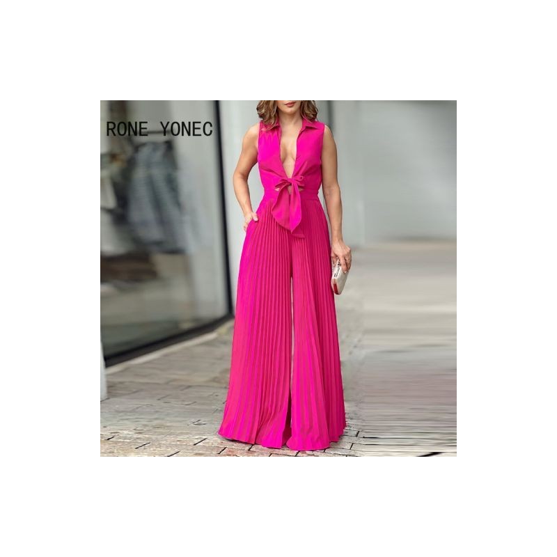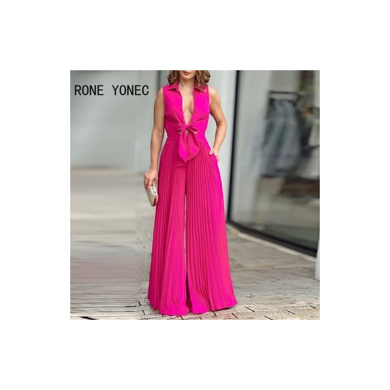 Women Elegant Solid Turn Down Collar Lace Up Bow Sleeveless Pleated Pocket Working Jumpsuit