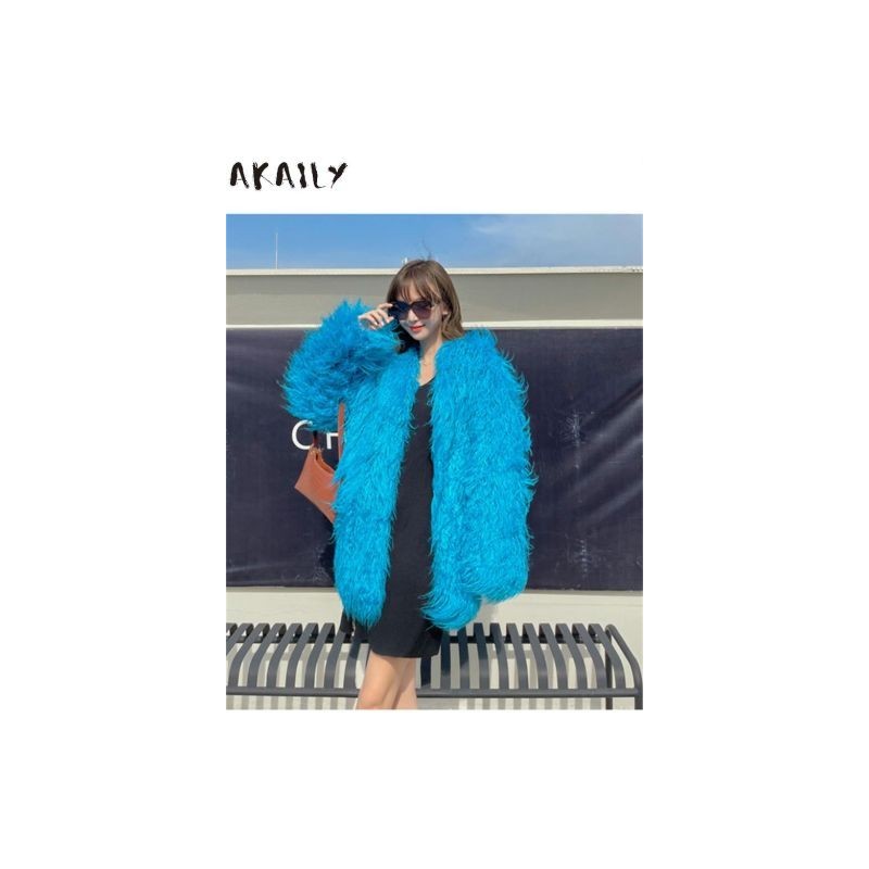 Akaily Solid Faux Fur Coats For Women 2023 Streetwear Long Sleeve V Neck Jackets Pink Casual Loose Coats New In Outerwears