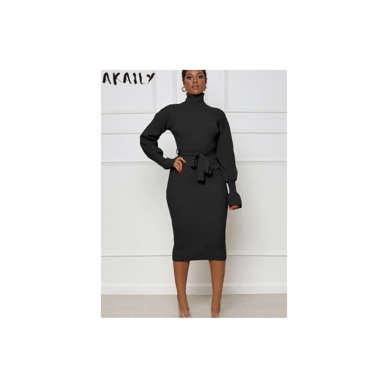 Akaily Fall Brown Knitted Maxi Dresses For Women Fashion 2022 Turtleneck Long Sleeve Elegants Dress Ladies Bandage Long Dress