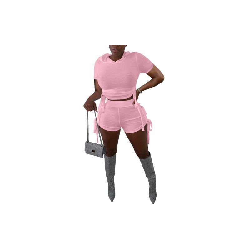 Sporty Solid Two Piece Set Women Skinny Toga Hooded Short Sleeve Sweatshirt and Casual Ruched Drawstring Short Pant Female Suits