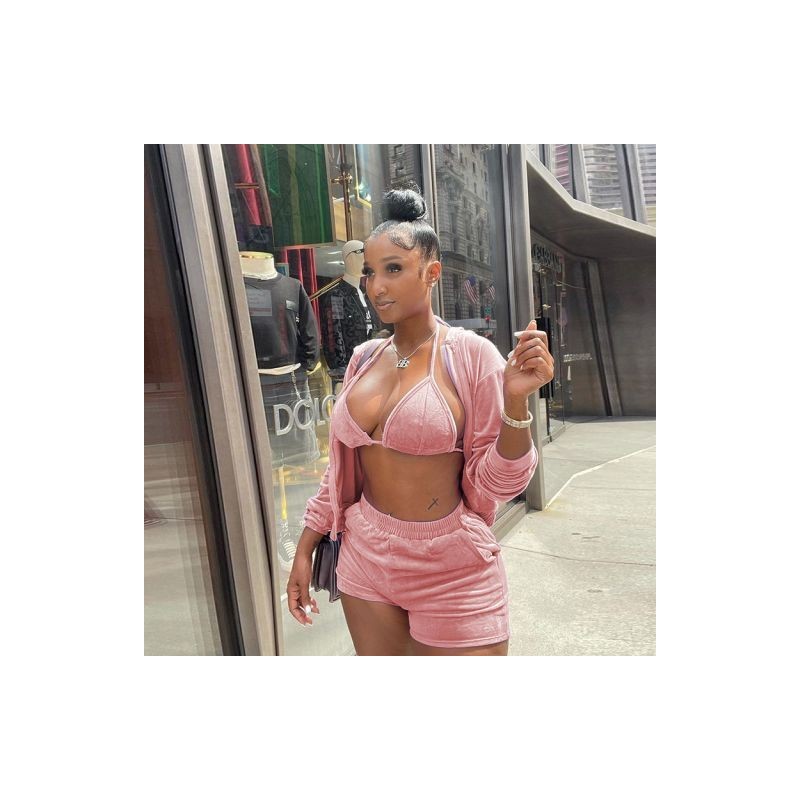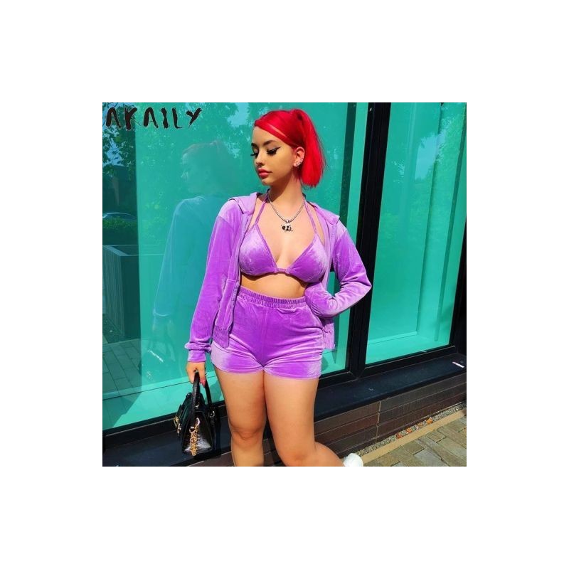 Akaily 2021 Autumn Pink 3 Three Piece Sets Tracksuit Womens Outfits Zipper Hoodies Halter Crop Top And Shorts Sets Suits Ladies