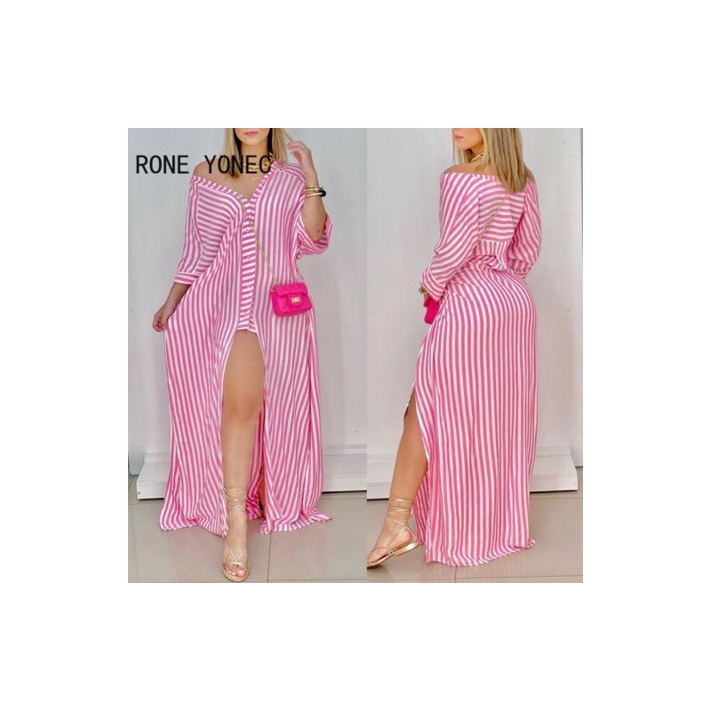 Women Casual Striped Slit V neck Sexy Maxi Dress