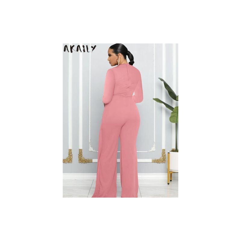 Akaily Fall Winter Black Jumpsuit For Women Casual One Piece Outfits 2022 Pink O Neck Cross Long SLeeve Bodycon Jumpsuit Ladies