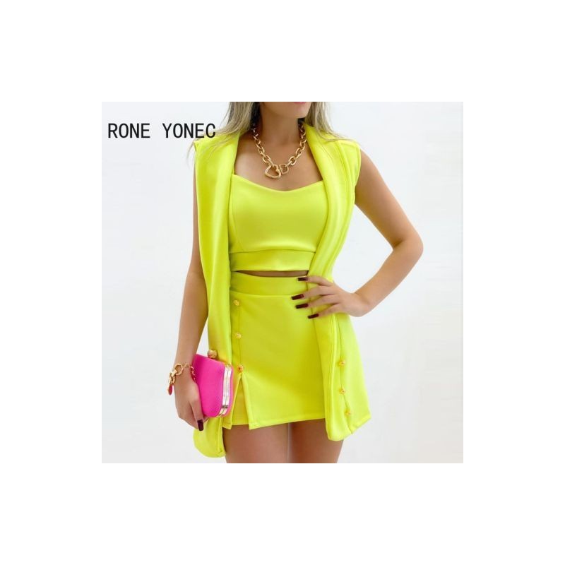 2023 Women Sexy Tank Button Decoration Open Stitch Crop Top Inside Three Pieces Sexy Short Sets