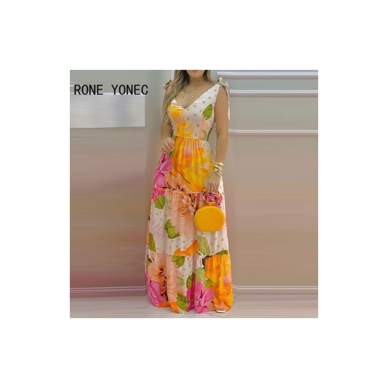 Women Elegant Dress Floral Print Sleeveless V-Neck Maxi Dress Summer Vacation Dress 2021