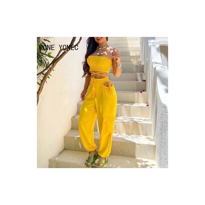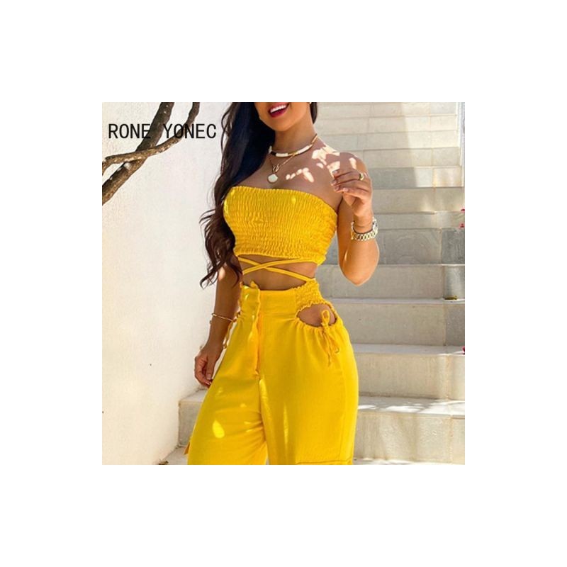 Women Fashion Strapless Crop Top Folds Criss Cross Lace Up Hollow Out Sexy Pocket Casual Pants Sets