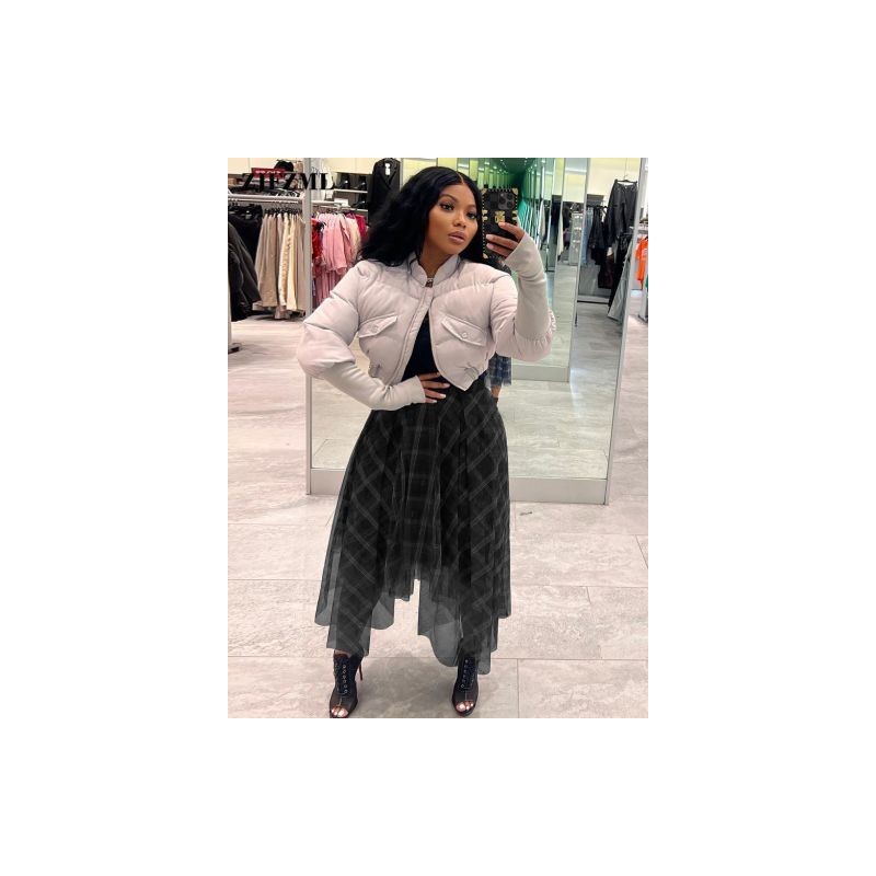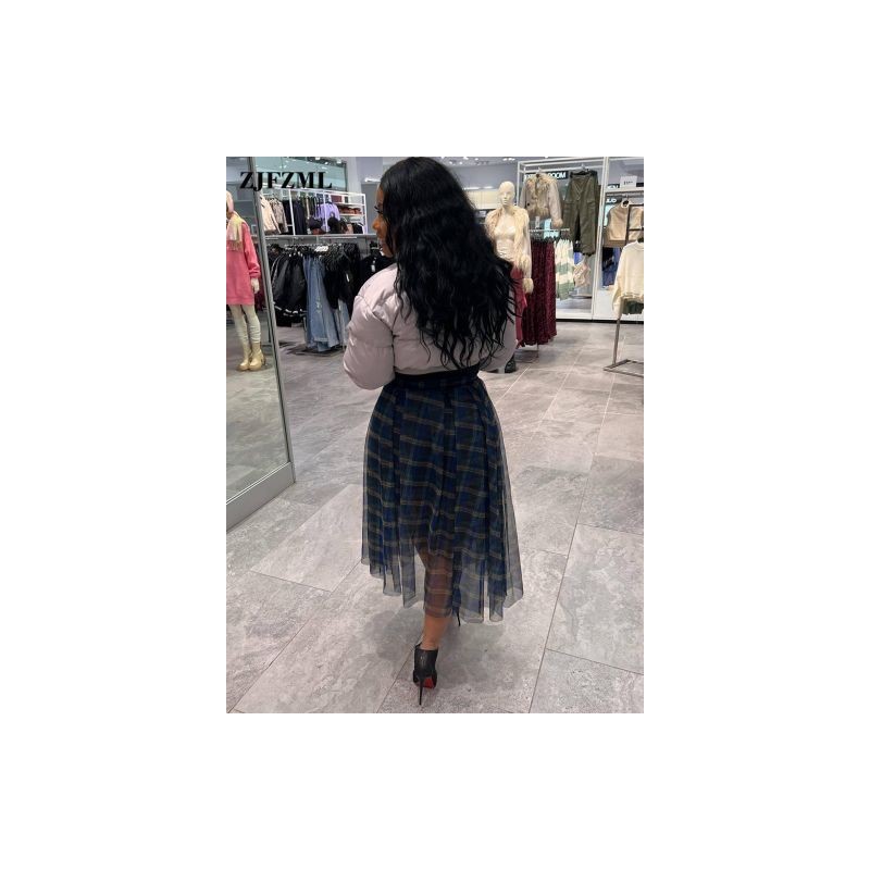 Sheer Mesh Plaid Patchwork Asymmetrical Skirt Woman Fashion Elastic High Waist A-line Skirt Vintage School Student Party Bottoms