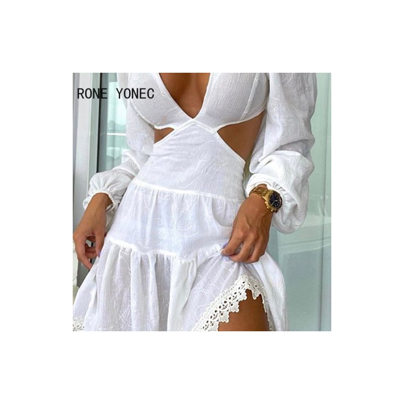 Women Elegant Dress Lace Trim Cutout Puff Sleeve Plunge Dress V Neck Casual Dress Vacation Dress 2021