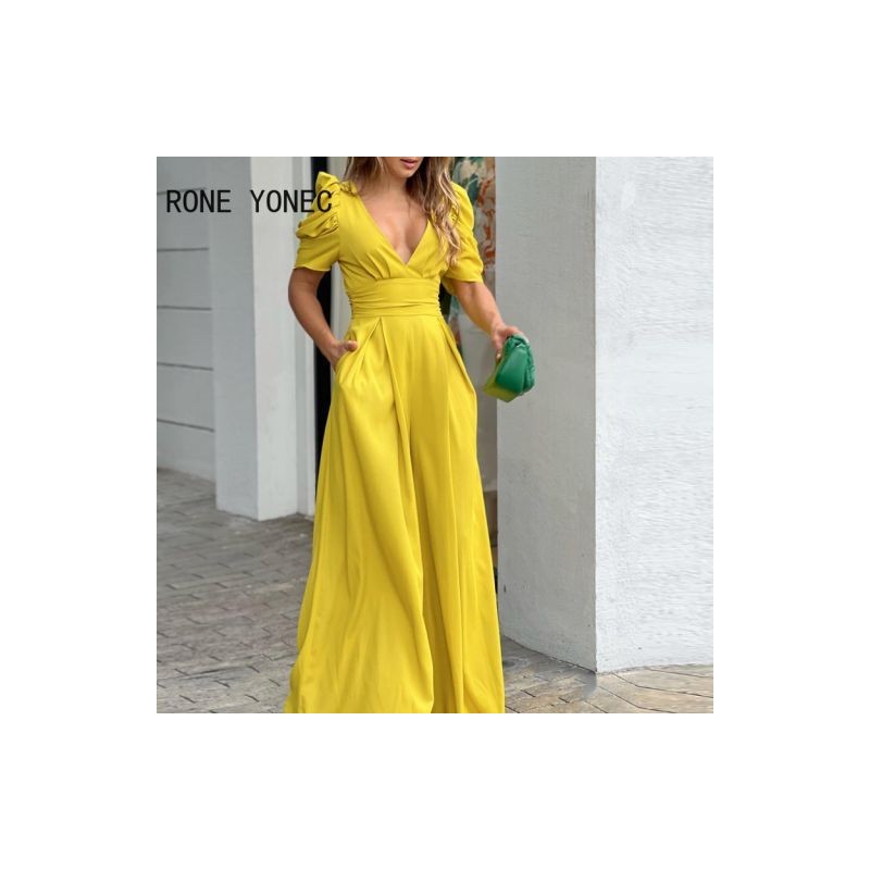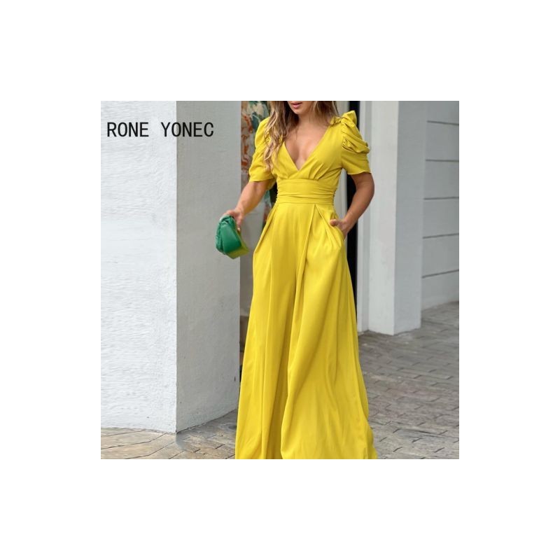 Női Elegáns Szexi Mély V nyakú, Rövid Puff ujjú Zseb, Széles Lábas Munkaköpeny