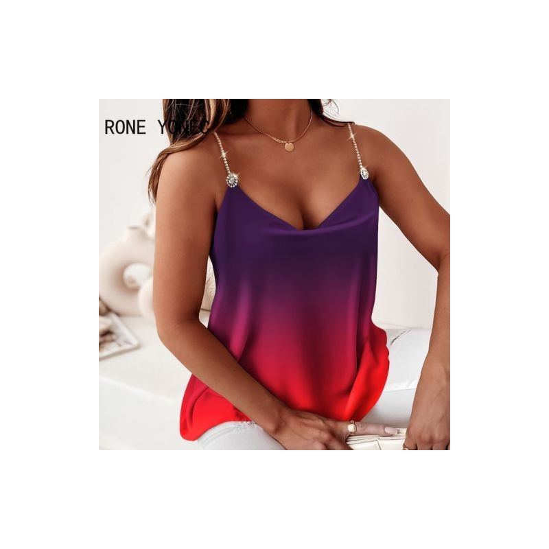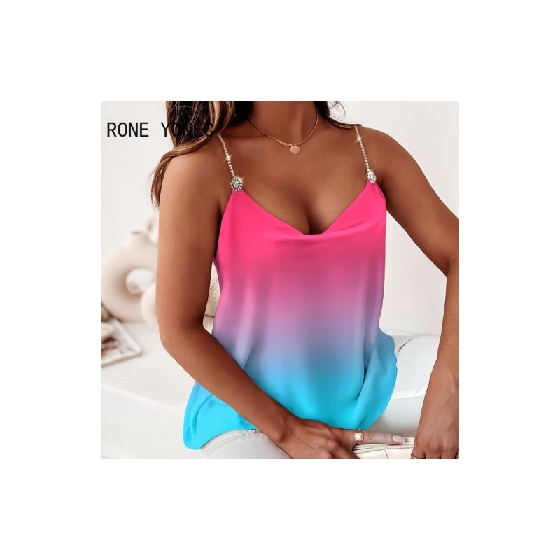 Women Chic Sexy Gradient Color V Neck Sleeveless Chain Straps Summer Casual Camis Crop Tops