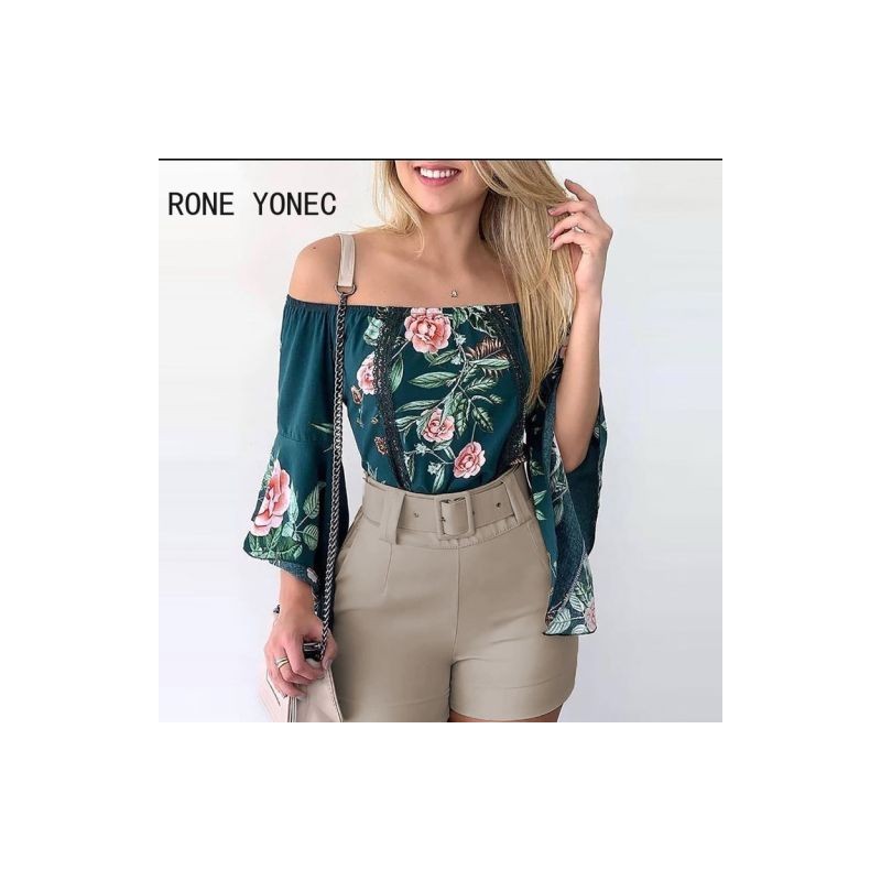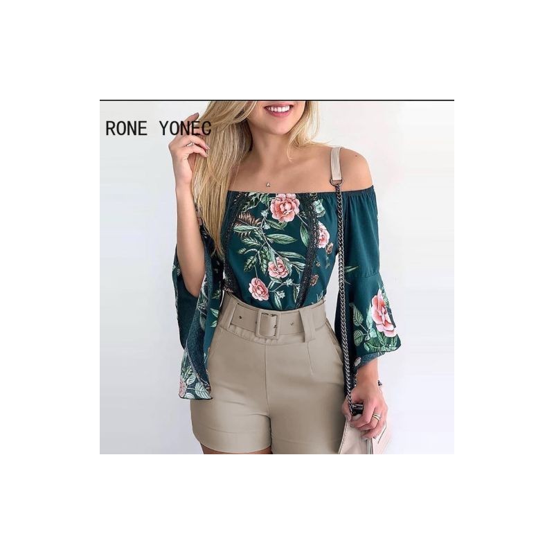 Women Casual Graphic Off Shoulder Lace Flared Sleeves Sashes Short Sets