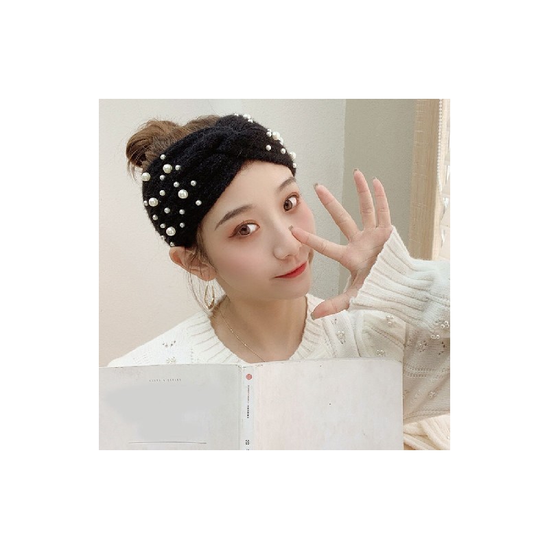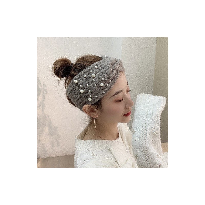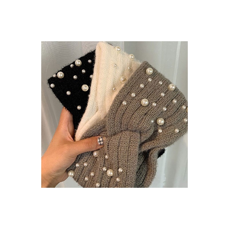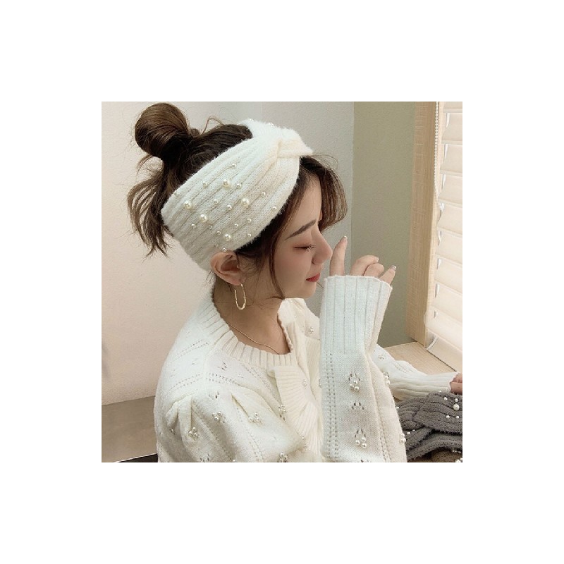 Elegant Women Pearl Headbands Autumn Winter Warm Knitted Cross Hairbands Wide Headwrap Ear Warmer Outdoor Running Accessories