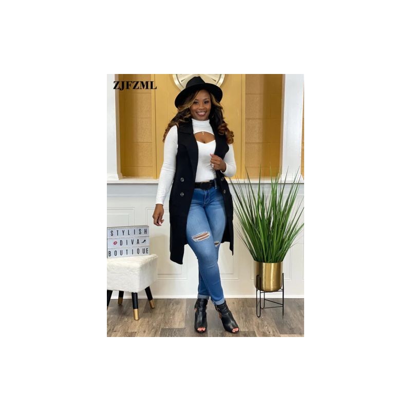 Őszi téli női kötött pulóver, hosszú mellény irodai női hornyolt gallér, ujjatlan felsőruházat, alkalmi duplasoros mellény felsők