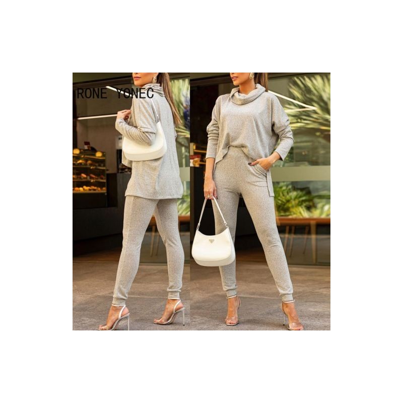 Női alkalmi tömör bolyhos gallér hosszú ujjú rugalmas derék sportos pulóver nadrág szett