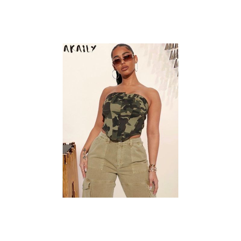 Akaily Summer Streetwear Tops Clothes For Women 2023 Slash Neck Sleeveless Zipper Crop Tank Tops Bodycon Camouflage Tee Shirts