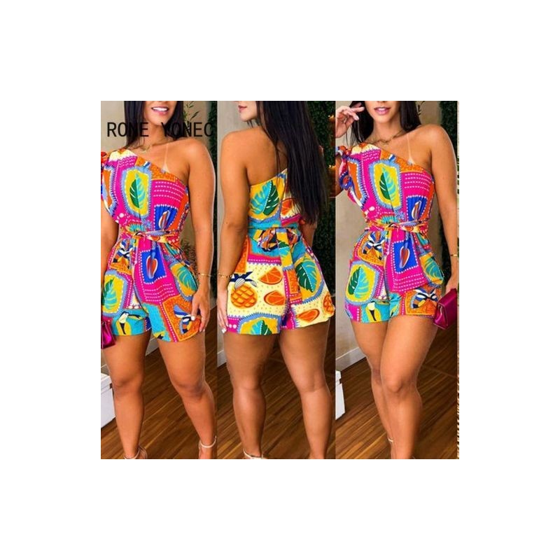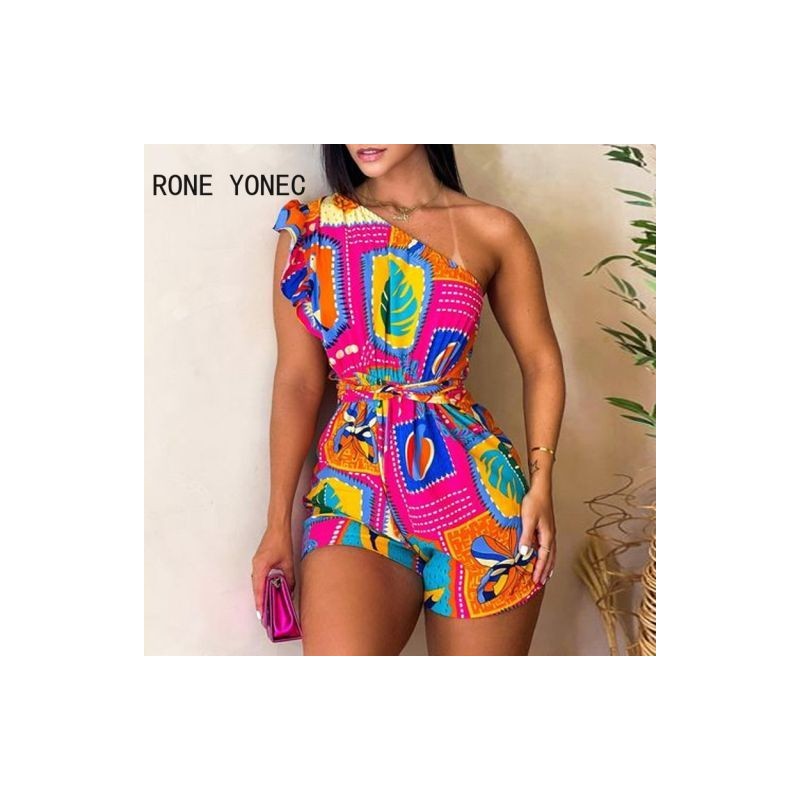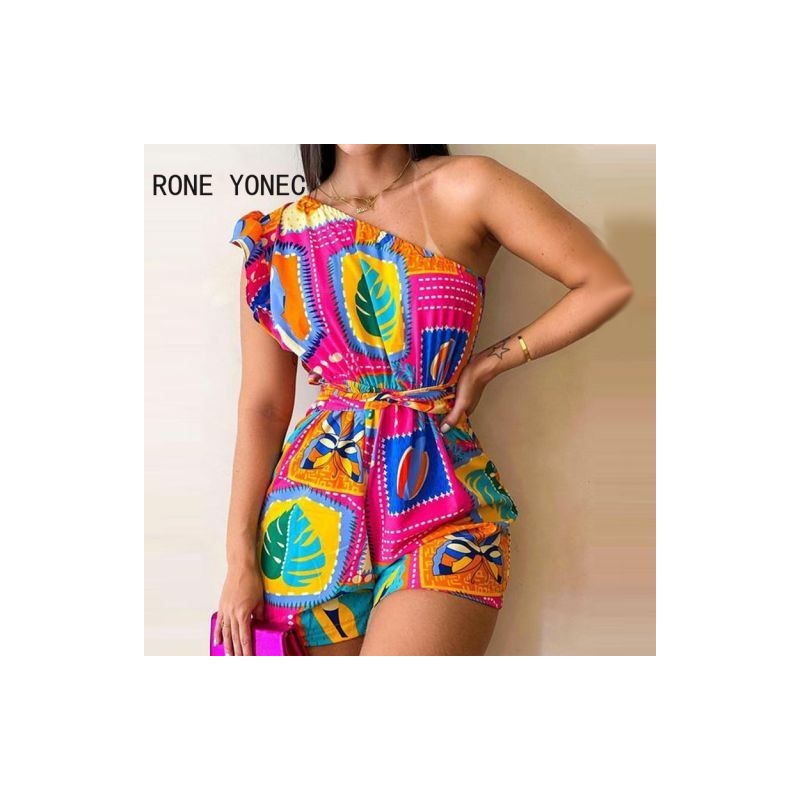 Women Chic All Over Print Diagonal Collar Lace Up One Shoudler Flying Sleeves Rompers