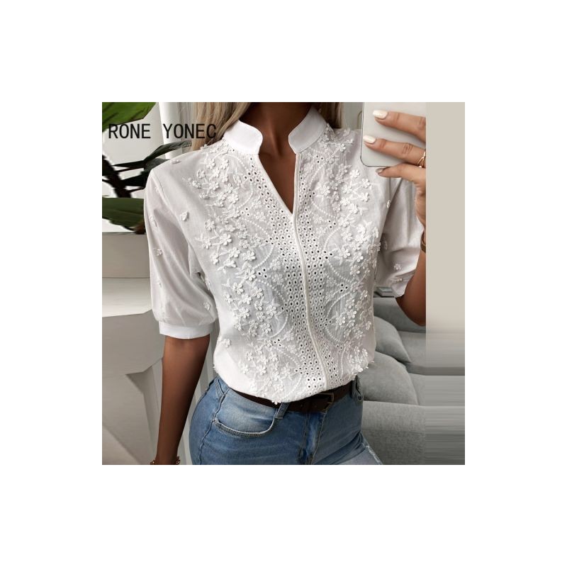 Women Casual Solid Hollow-out Floral V neck Chic Blouse