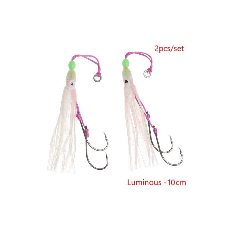 Material: Plastic Metal Color: Luminous / Pink(Optional) Size: 6cm / 2.3in,10cm / 3.9in, 12cm / 4.7in(Optional) Package Size: 14 * 10 * 1cm / 5.3 * 3.9 * 0.3in Package Weight: 8-15g / 0.2-0.5oz Features: Soft lures squid bait with realistic design, lifelike swimming actions. Made of premium plastic, soft and flexible. Come with luminous beads glow brightly in the dark to attract big fish. Double super piercing barbed hook, easy to catch the fish. Metal ring design, convenient to tie on the fishing line. Great fishing tackle for anglers. Package List: 2 * Fishing Lure