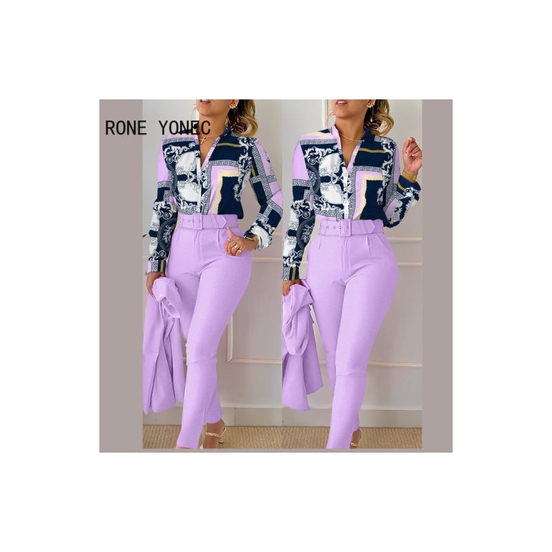 2023 Women Casual All Over Print Long Sleeves Stand Collar with Belt Working shirt & Pants Set
