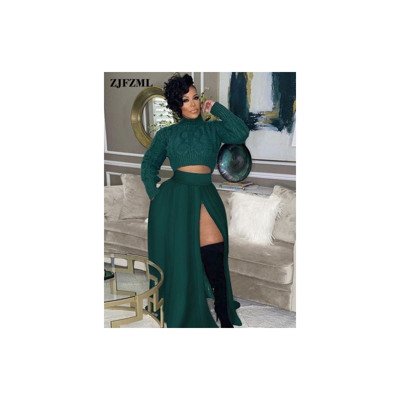 Lenyűgöző, kétrészes öltönyök női garbó nyakú, hosszú ujjú, kötött pulóver felsők és oldalt magasan osztott padlóhosszú szoknyaruha
