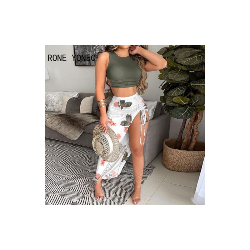 Women Drawstring Ruched Top & Floral Print High Slit Skirt Set Casual Summer Suit