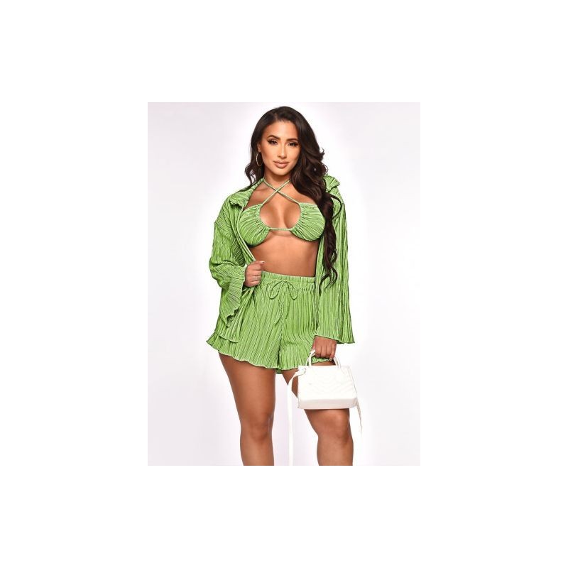 Sexy Stretchy 3 Piece Matching Set Summer Holiday Outfit for Women Cross Halter Bra Tops drawstring Waist Short long Sleeve Coat
