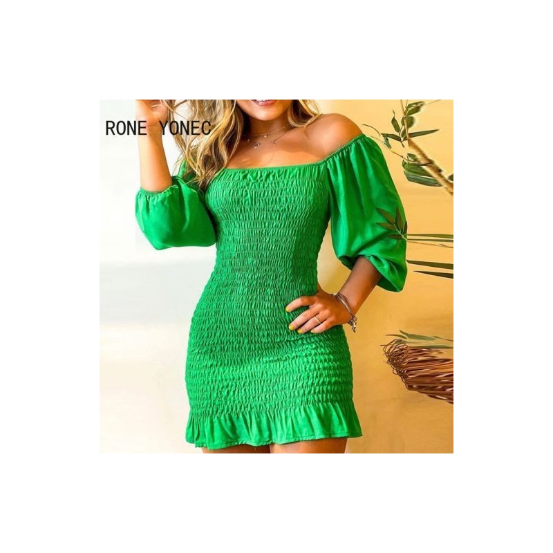 Women Solid Off Shoulder Three Quarter Sleeves Sexy Bodycon Ruffle Hems Folds Mini Sexy Party Dresses