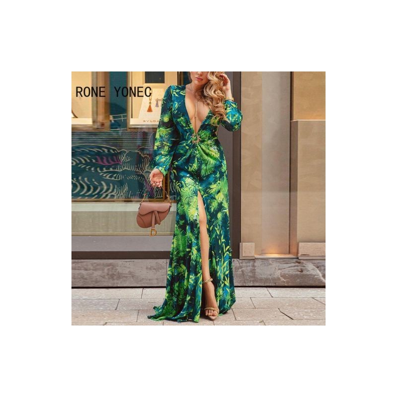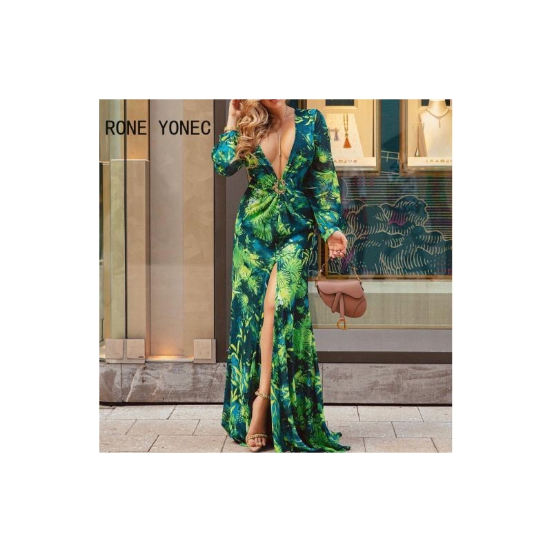 Women Elegant Chiffon Deep V-neck High Silt Leaf Pattern Maxi Green Vacation Dresses