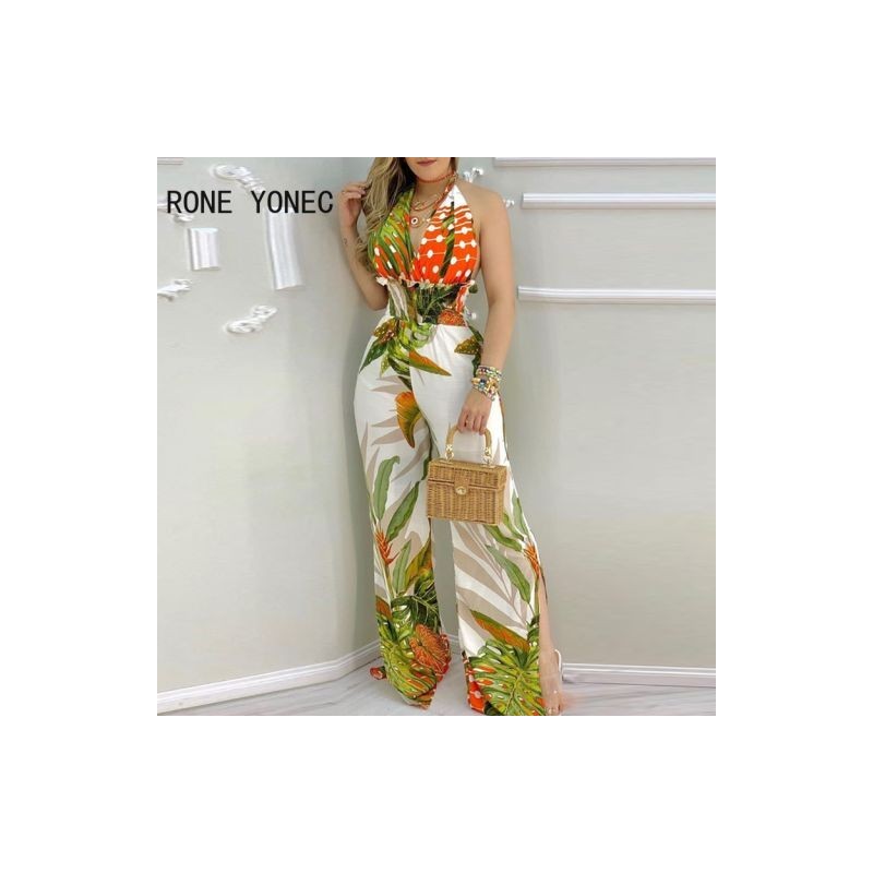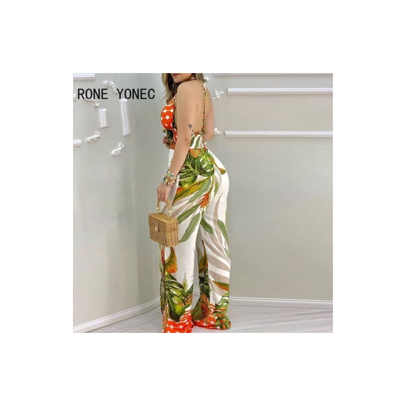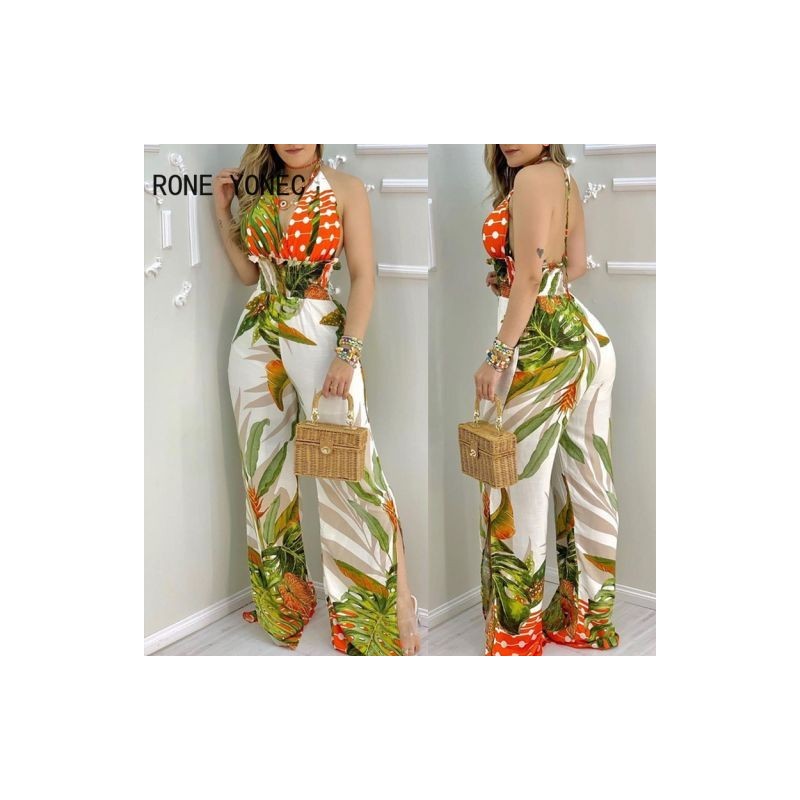 Női ruhák Trópusi mintás, háttámla nélküli ráncfelvarrás részletgazdag, női nyári jumpsuit