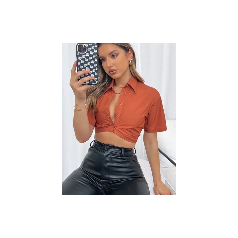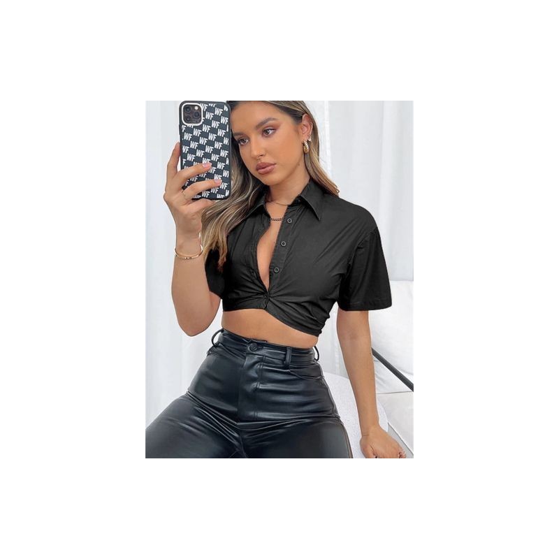 Akaily Fall Black Street T Shirt For Women 2022 Turn Down Collar Button Up Short Sleeve Tee Shirts Fashion Solid Basic T Shirt