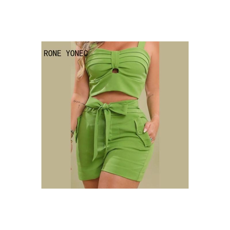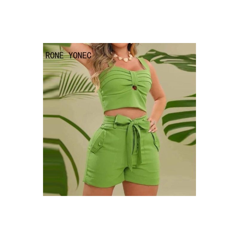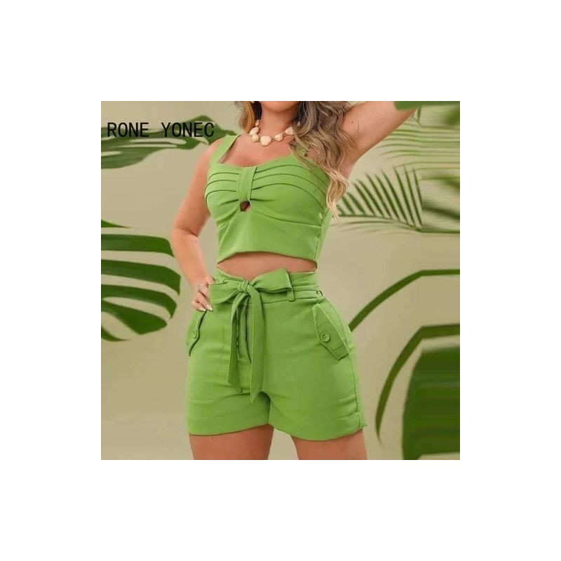 Women Casual Thick Straps Hollow Out Crop Top Solid with Belts Pocket Summer Short Sets