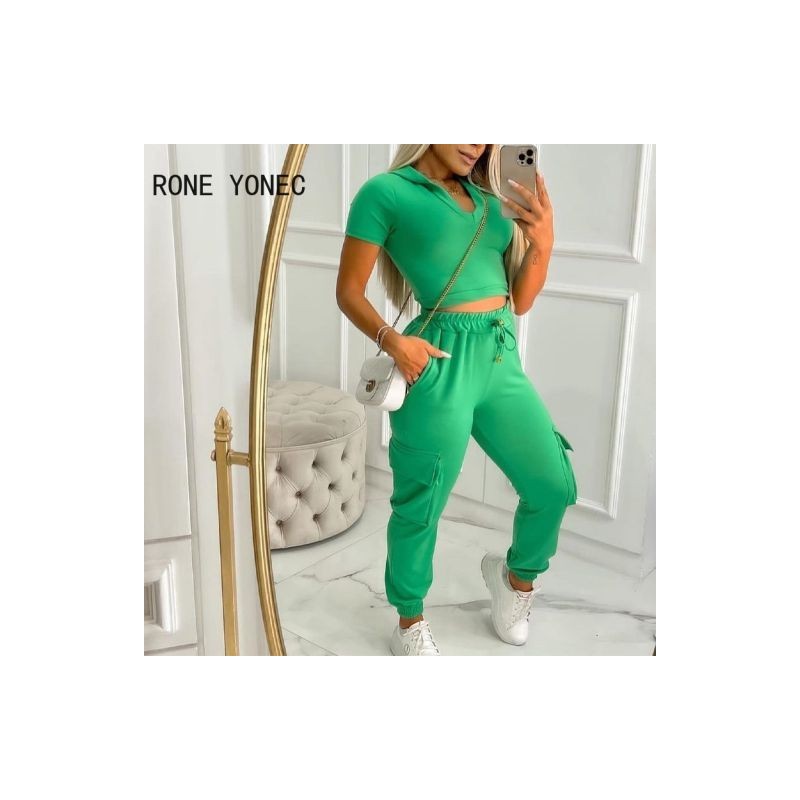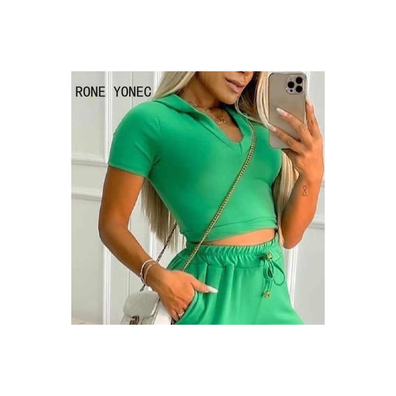 Női tömör, elegáns kapucnis Crop Top V nyakú, rugalmas derékzseb, húzózsinóros alkalmi nadrág szettek