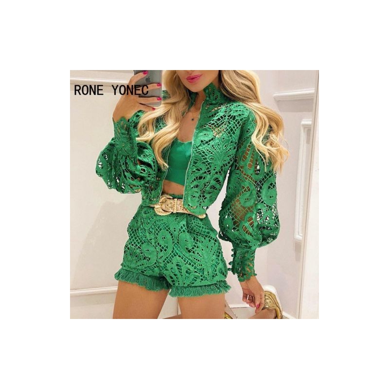 Women Solid Hollow-out Puff Sleeve Sexy Short Sets
