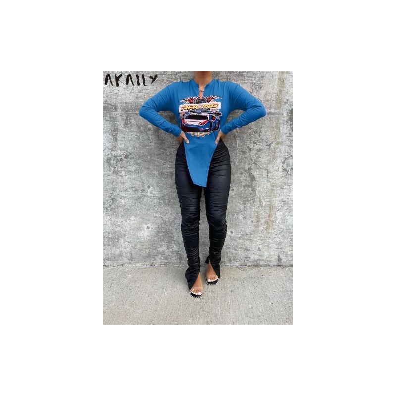 Akaily Fall Black Graphic T Shirts For Womens Fashion 2022 O Neck Long Sleeve Asymmetrical Tops Ladies Loose Casual Print Tops