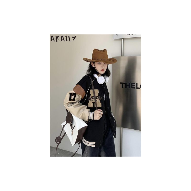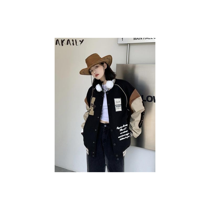 Akaily Fall Embroidery Baseball Jackets For Women Streetwear 2022 Patchwork Long Sleeve Coats Ladies Varsity Bomber Jackets