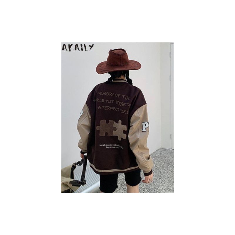 Akaily őszi leveles hímzésű női baseball dzsekik 2022 fekete Patchwork hosszú ujjú kabátok Női Varsity Bomber dzsekik